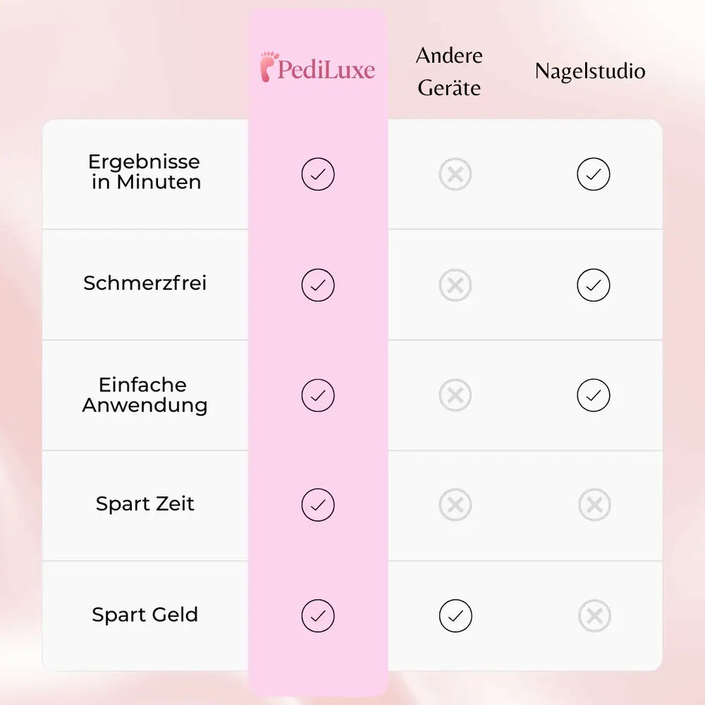 Bimssteine, Feilen und andere Hilfsmittel sind oft mühsam, schmerzhaft oder bringen kaum Ergebnisse. Pediküre im Studio kostet Zeit und Geld. Mit dem PediLuxe, dem Nr. 1 bewerteten elektrischen Hornhautentferner erreichst du in wenigen Minuten glatte, gepflegte Füße ganz bequem von zuhause.