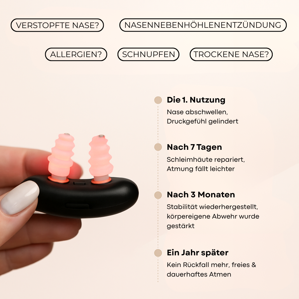 Führe das Gerät vorsichtig in Deine Nasenlöcher ein. Lasse das Gerät 10 Minuten lang eingeschaltet.